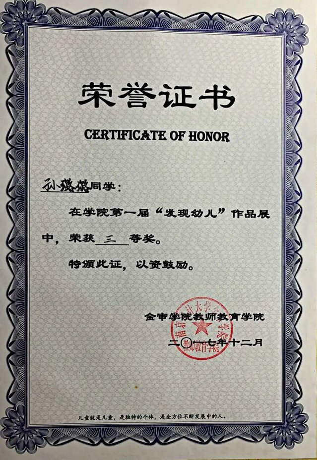 孙璐璐,学前17级1班共青团员,性格开朗,认真负责。在校期间获得教师资格证,英语四六级 ,普通话考试,钢琴十级等技能资格证书。考取扬州大学学前教育学专业研究生。
