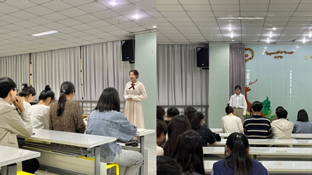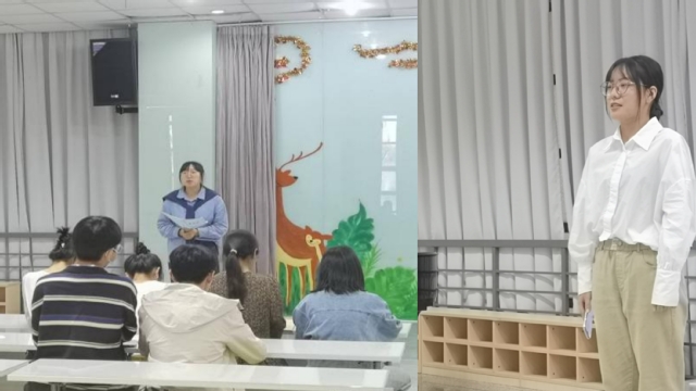 采访中参赛者翟婷芳同学谈到本次演讲比赛中她有两点具体感受,第一就是一种新的尝试,曾经只是出于对于朗诵的爱好,或者说被这种朗诵的爱好带动了,她想在大家面前表达她所想的这种看法,第二就是不断的改稿子,不断的去练习的这种枯燥和乏味,但是去展现自己的时候,会有一种倾尽所有把自己表达出来的感觉,把自己展现出来的这种勇气逐渐提升。