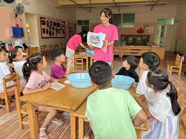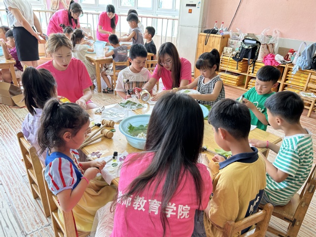 实践小分队共分成三组,带领丰县童馨幼儿园的小朋友们开展植物敲拓染、纸浆造纸和传统游戏活动。植物敲拓染组的成员们带领小朋友识别幼儿园内的植物,选择自己喜欢的在方巾上摆好造型,用胶带纸固定,继而用锤子用力敲打,撕掉胶带后得到有趣的作品。纸浆造纸组则带领小朋友们在水中打散造纸浆,然后加入造纸胶,用勺子舀起纸浆均匀地铺在网框上,进行装饰后再铺上薄薄的一层纸浆,最后晾晒和展示各自的作品。传统游戏小组则带领幼儿进行与传统文化有关的游戏,譬如捉龙尾、拍毽子、剪纸等。一周内三个小组的成员们和小朋友们亲密相处,在轻松快乐的活动氛围中挖掘传统文化的内涵,领悟到了拓印、造纸等多项传统工艺的魅力。
