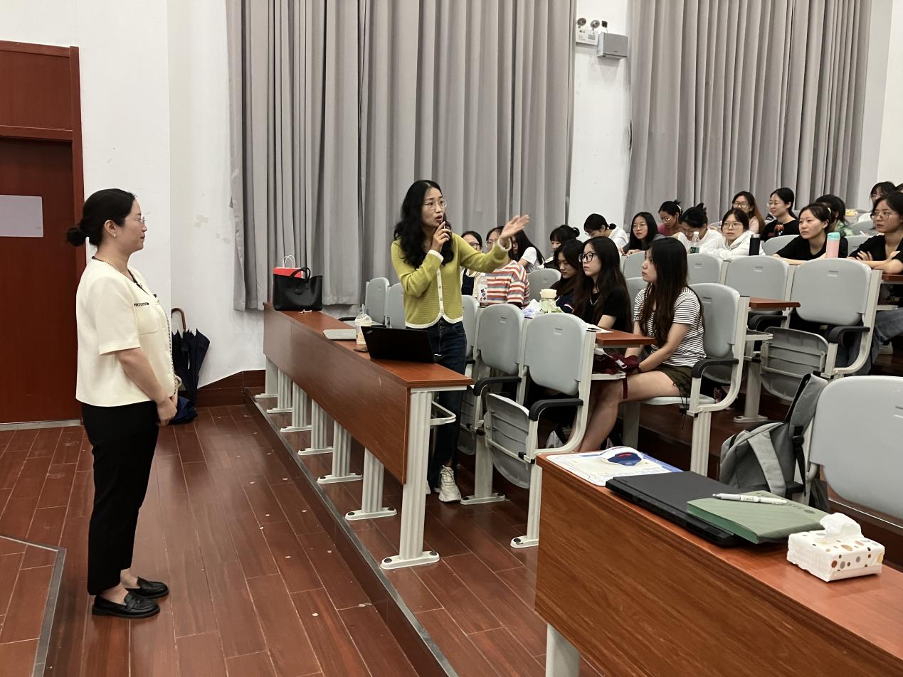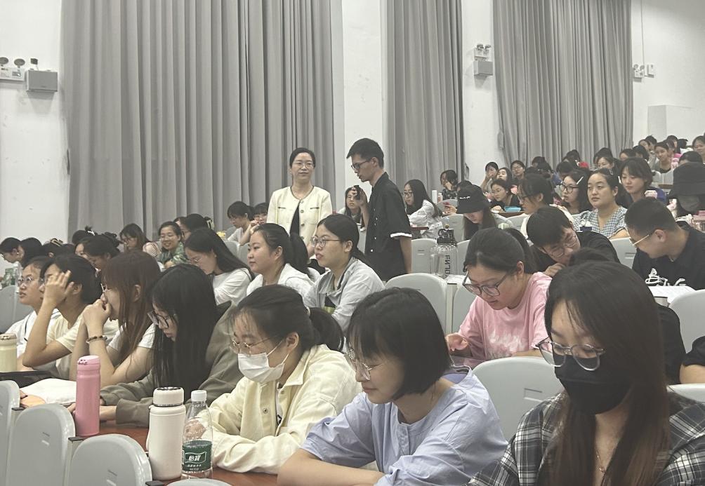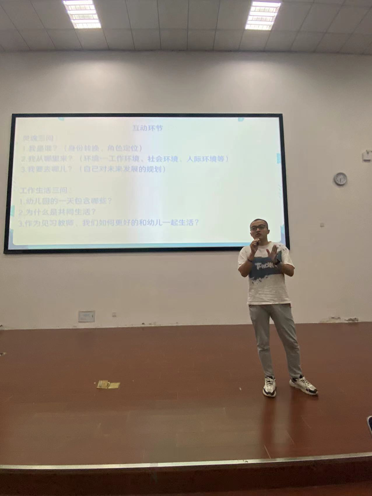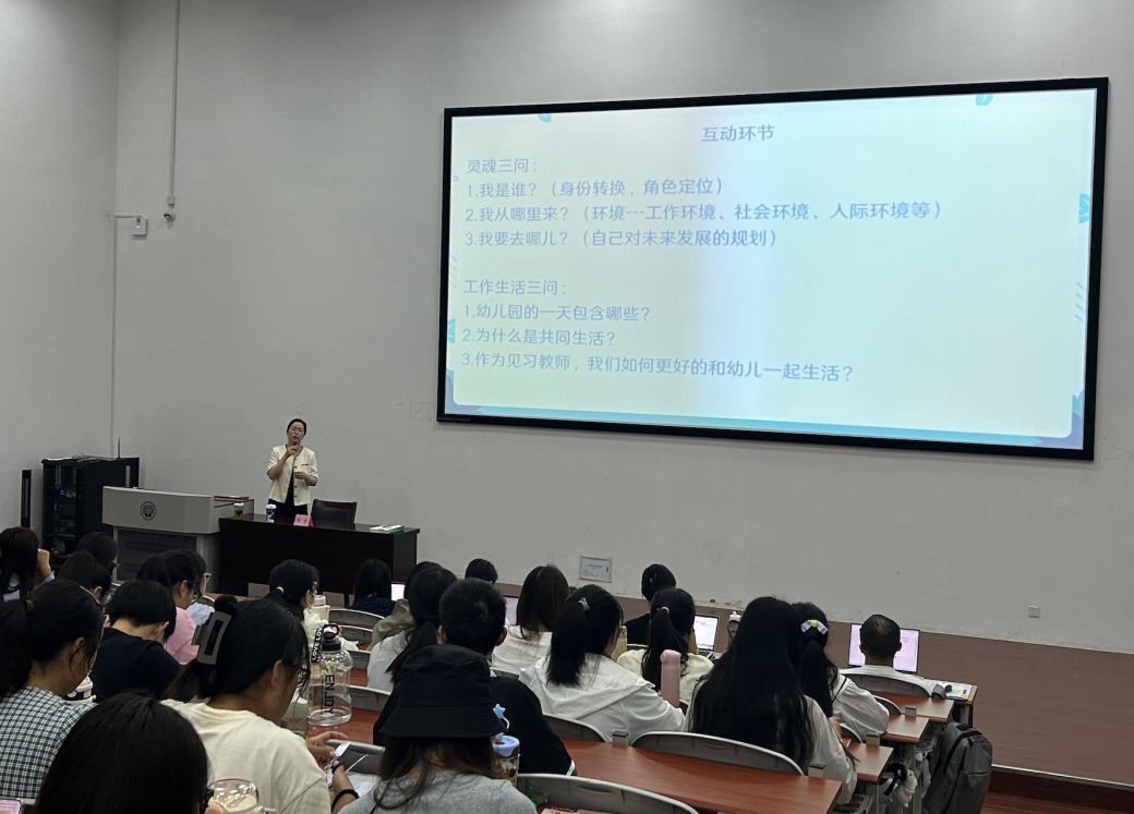 首先,陈园长通过互动环节——灵魂三问(我是谁;我从哪里来;我要去那儿)和工作生活三问(幼儿园一天包含哪些;为什么是共同生活;作为见习教师,我们如何更好的和幼儿一起生活),拉近和学生们的心理距离。在轻松愉悦氛围的下,大家纷纷发表看法。
