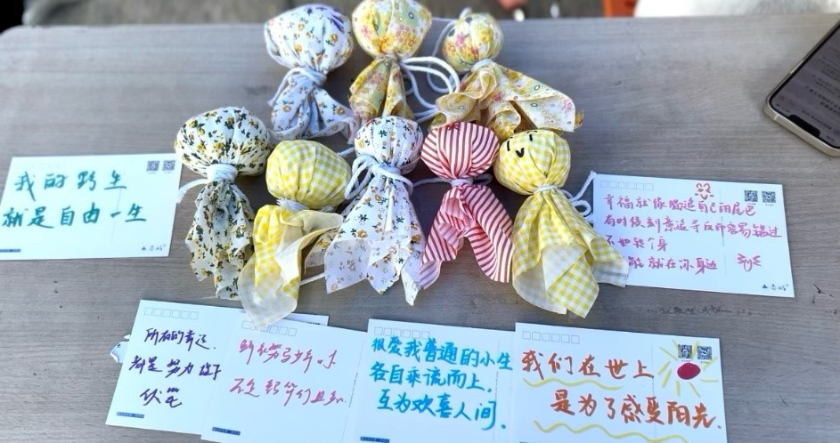 临近尾声,形态各异的手工娃娃“排排挂”,有的眯眼浅笑,有的脸颊晕红,宛如传递阳光的“使者”。从设计到色彩的搭配,再到将之前记录下的心灵寄语融入其中,每一步都凝聚着同学们的心血与期待。