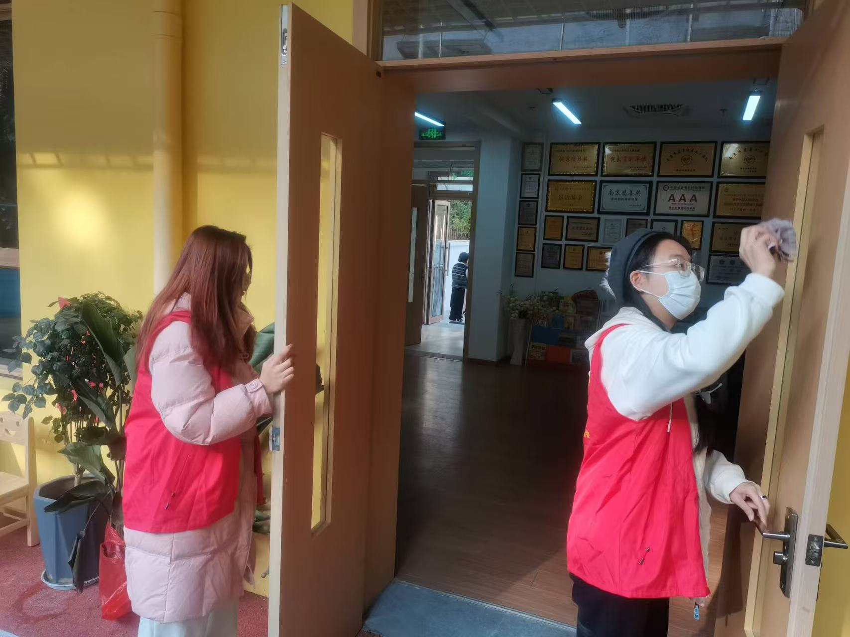 此外,另一队志愿者进行环境卫生打扫活动。他们用抹布抹去大门和教室门窗的污渍及灰尘,让发展中心以崭新的面貌迎接新年的到来。
