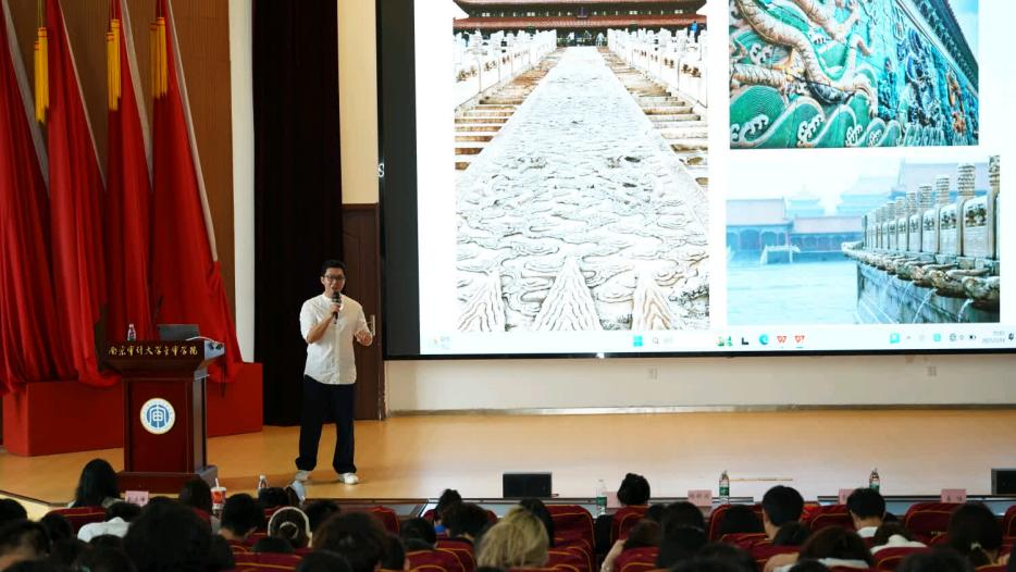 讲座现场,李牧教授以其深厚的学术造诣和独特的艺术视角,带领在场师生深入领略了中华龙文化的独特魅力。讲解中,李牧教授以《山海经》为钥匙,旁征博引带领我们打开龙文化的大门,通过大量精美的图片和详实的考古资料,生动地展示了不同载体上龙的形象演变。从威严庄重的商周青铜龙纹,到灵动飘逸的唐代陶瓷龙饰,他细致剖析了每一个时期、每一种工艺中的龙所被赋予的独特的时代内涵,让在场师生仿佛穿越时空,亲眼目睹了龙文化在历史长河中的熠熠生辉。