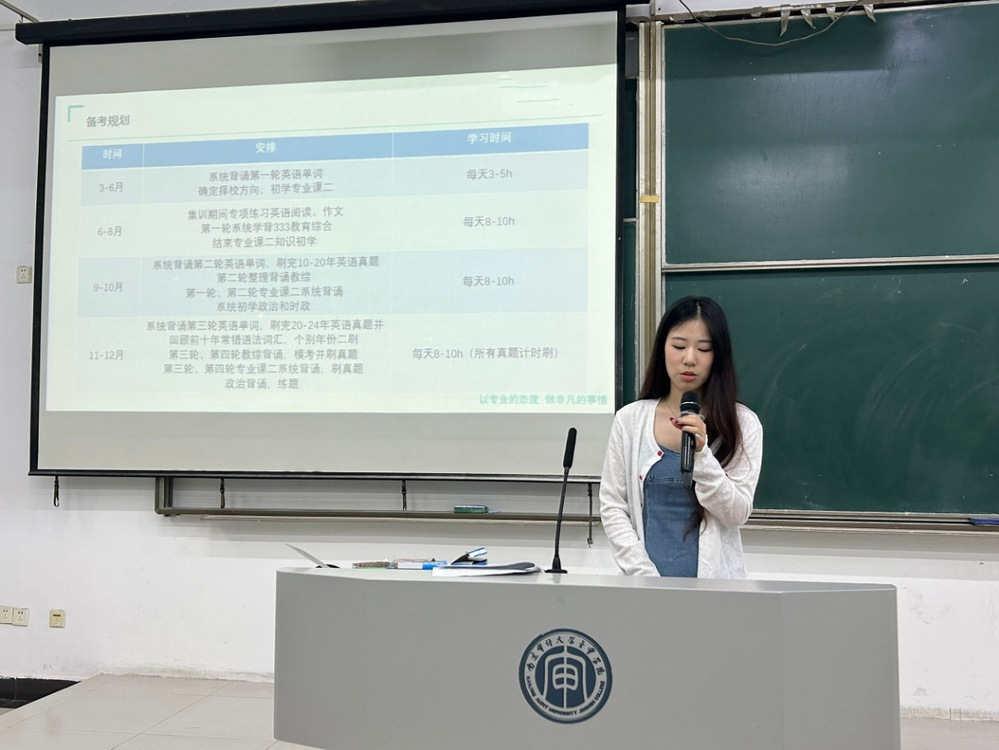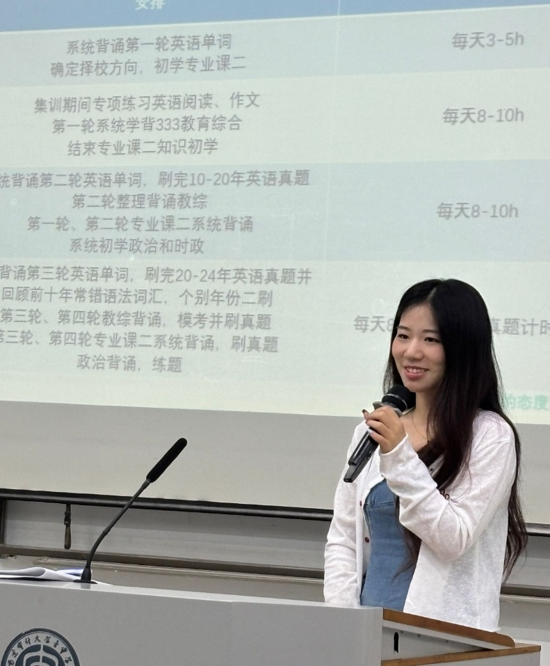 讲座伊始,朱梓瑆结合自身考研经历,以幽默风趣的语言,拉近了与学弟学妹的距离,分享了自己的备考历程与心得体会。本科期间成绩中游的她坦言,自己也曾因选择院校、复习规划等问题陷入焦虑,但通过科学的方法和持续的努力,最终优异成绩成功考入心仪学校。强调理想信念是考研路上的精神灯塔,而“目标明确,规划先行”、“高效学习,巧用资源”、“心态管理,坚持到底”是成功的三大法宝。