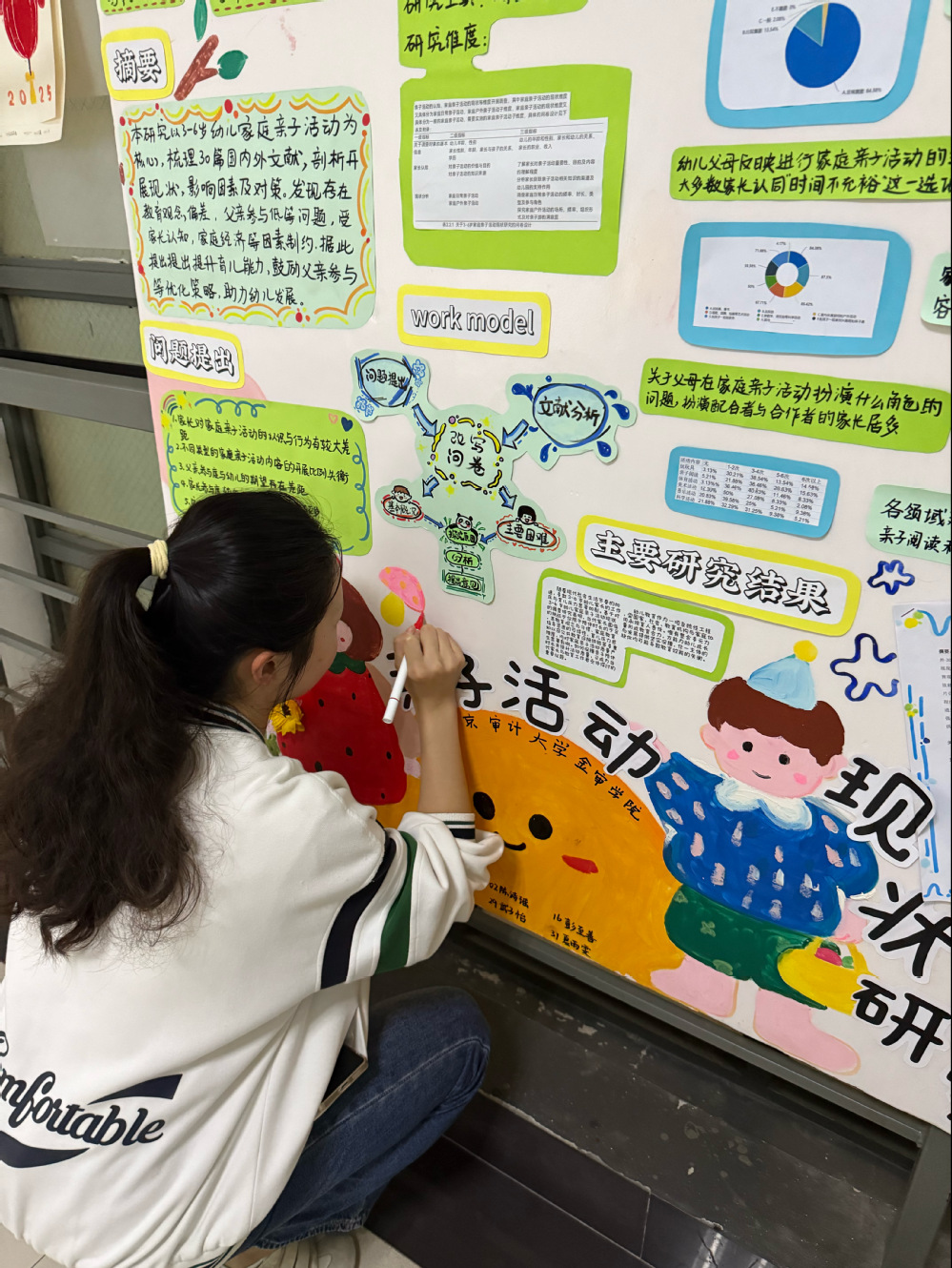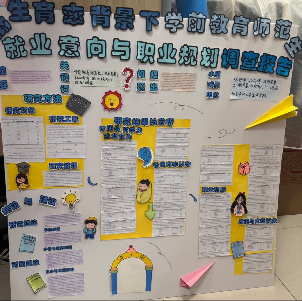 实训周期间,学生们围绕学前专业本科生关注的专业问题及社会现象,深入开展了以问卷和访谈为主的社会调查。在完成数据收集与整理工作后,各小组撰写了规范的调查报告,并将调查过程与核心成果精心设计、制作成KT板学术海报进行展示。