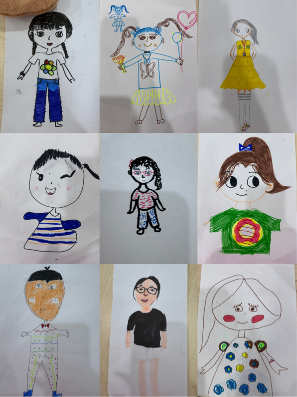 在创意绘画环节,孩子们用画笔描绘带有个人鲜明特征的自画像。通过“圆眼镜”“双马尾”“彩虹T恤”等细节,同伴们踊跃竞猜画作主人,现场笑声不断。活动不仅锻炼观察力,更促进儿童自我表达与社交互动。