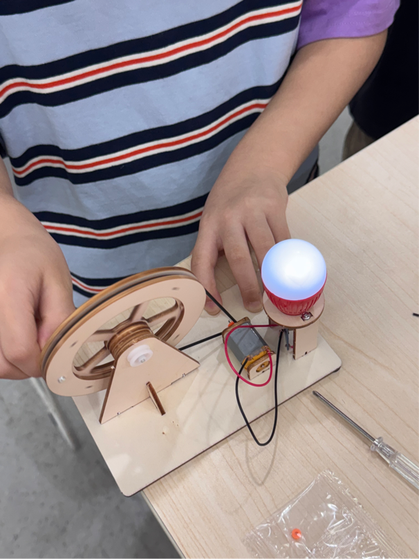 压轴环节中,志愿者带领孩子们动手制作简易手摇发电机,同步讲解电磁感应原理。“线圈切割磁感线就能发电!”孩子们在齿轮转动与灯泡亮起的瞬间欢呼雀跃,亲身验证了法拉第的伟大发现。