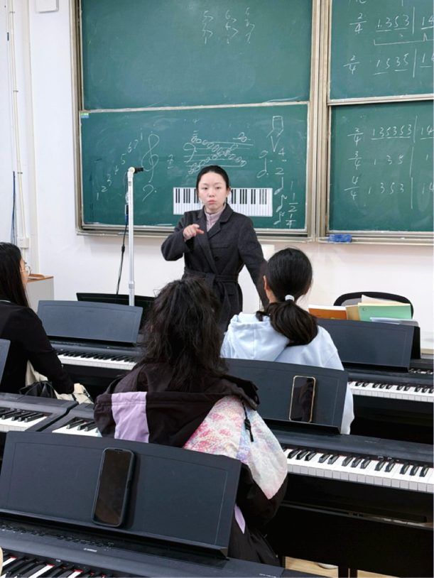 课程伊始,蒋老师从钢琴演奏的基础技法入手,系统讲解分解和弦的织体特点与弹奏逻辑,通过现场示范拆解指法难点,引导学生们理解和声如何为旋律“筑基”;随后聚焦踏板使用的细节技巧,结合音色变化演示延音踏板的踩放时机,让学生在实践中掌握“让琴声更富情感”的关键方法。扎实的技艺讲解为后续的思政融入打下坚实基础,让“以技载情”有了专业支撑。
