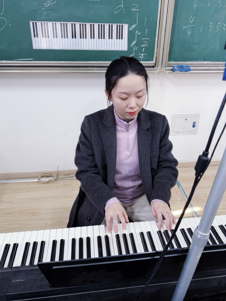 蒋老师边说边现场即兴伴奏,指尖流转间,学生们清晰看到“技巧如何服务与情感”。她用流畅的分解和弦铺垫温情基调,借踏板控制营造恢弘氛围,让熟悉的旋律化作生动的“思政教材”,在场师生深受感染。课程尾声,蒋老师为本次课程做总结,也向同学们提出期许:“音乐不仅是声音的艺术,更是思想的载体,我们更应该看到音乐中所蕴含的普世价值和民族精神。希望同学们在今后的演奏中,不仅能‘弹得对’,更能‘弹得懂’,让指尖流淌的每一个音符,都承载着我们对真、善、美的追求,对祖国深沉的爱。这就是我们作为音乐学习者的时代担当”。