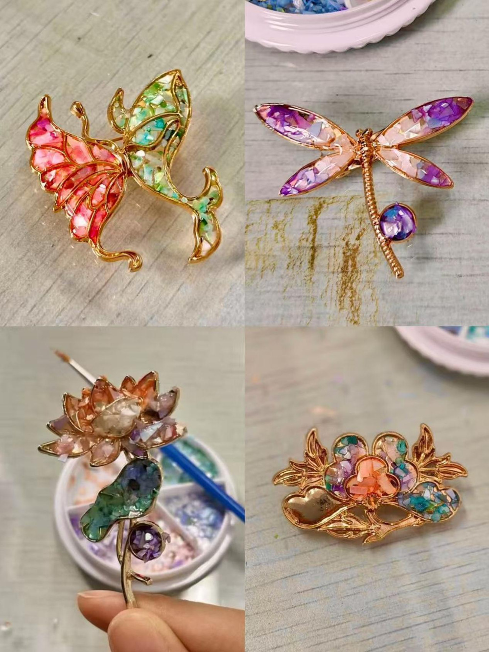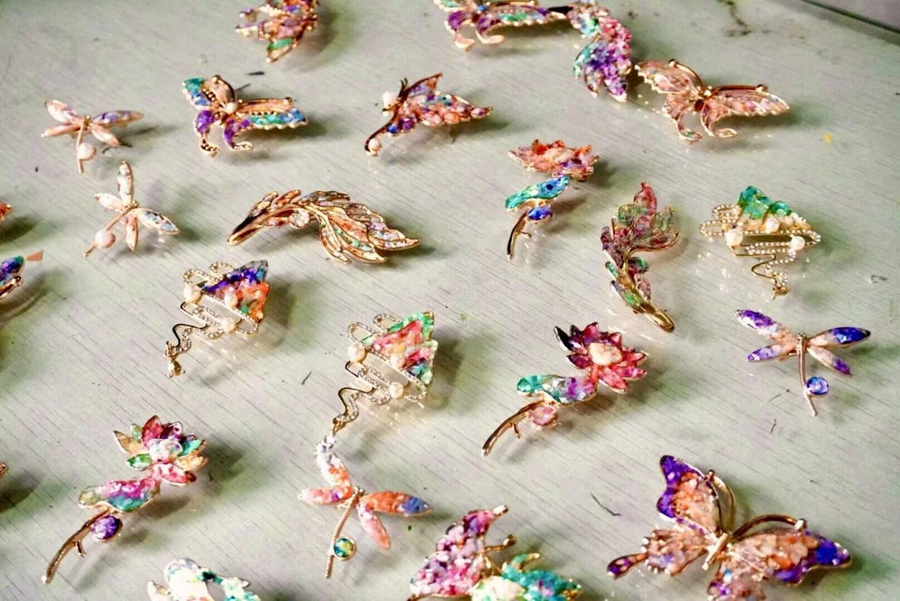 经过一番巧思制作,一枚枚融合重阳意蕴与巧思的胸针精彩呈现。有的以蝴蝶造型为主体,翅膀镶嵌的彩色螺钿如秋日斑斓景致,搭配珍珠点缀,尽显灵动雅致;有的青山形胸针将青绿色螺钿与金属框架巧妙结合,打造出或清新或复古的风格,每一处细节都饱含着对重阳的独特诠释。