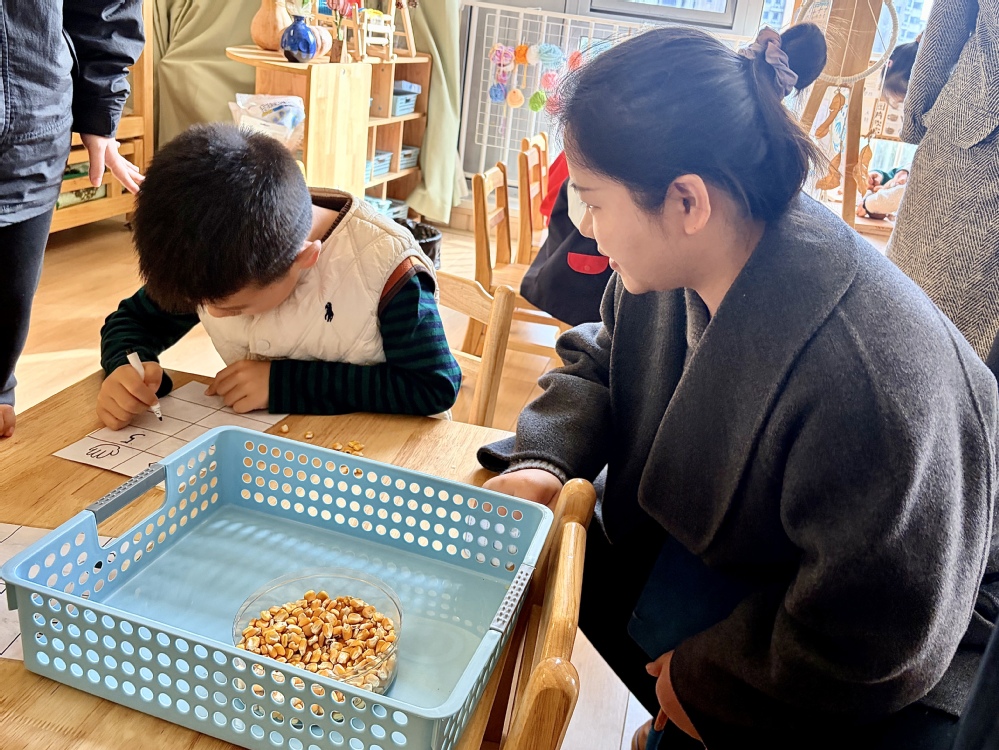 汇报环节中,实习生们基于《3-6岁儿童学习与发展指南》,分别围绕小、中、大三个年龄班幼儿的发展特点,系统阐述了益智区的创设理念与过程。他们巧妙利用生活化、游戏化的材料,设计了涵盖空间感知、数量关系、逻辑推理等多维度的益智活动,充分体现了将理论知识转化为实践环境的能力。随后,实习生、学院指导教师与园方指导教师一齐走进班级进行现场观摩。实习生们引导幼儿开展区域活动,展现了良好的师幼互动与专业素养。