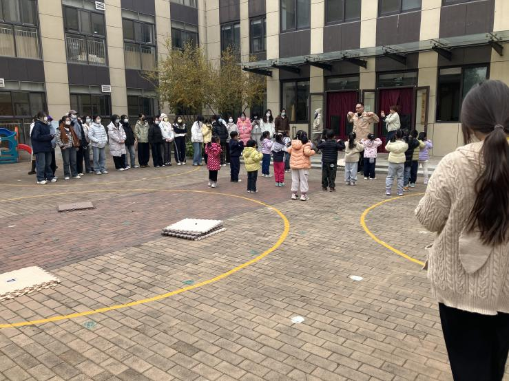 学生们认真观摩了园所特色活动——户外混龄自主游戏以及两节健康领域集体教学活动。在户外游戏中,幼儿跨越年龄界限共同游戏,展现了混龄教育中幼儿社会性发展与运动能力的自然融合。随后,学生们观摩了大班健康活动《国王生病了》与大班体育活动《有趣的跳格子》。前者以绘本为载体,引导幼儿制定运动计划,理解坚持运动的重要性;后者则以传统游戏“跳格子”为基础,融合规则意识与身体协调训练,体现了“游戏中学习”的教育理念。