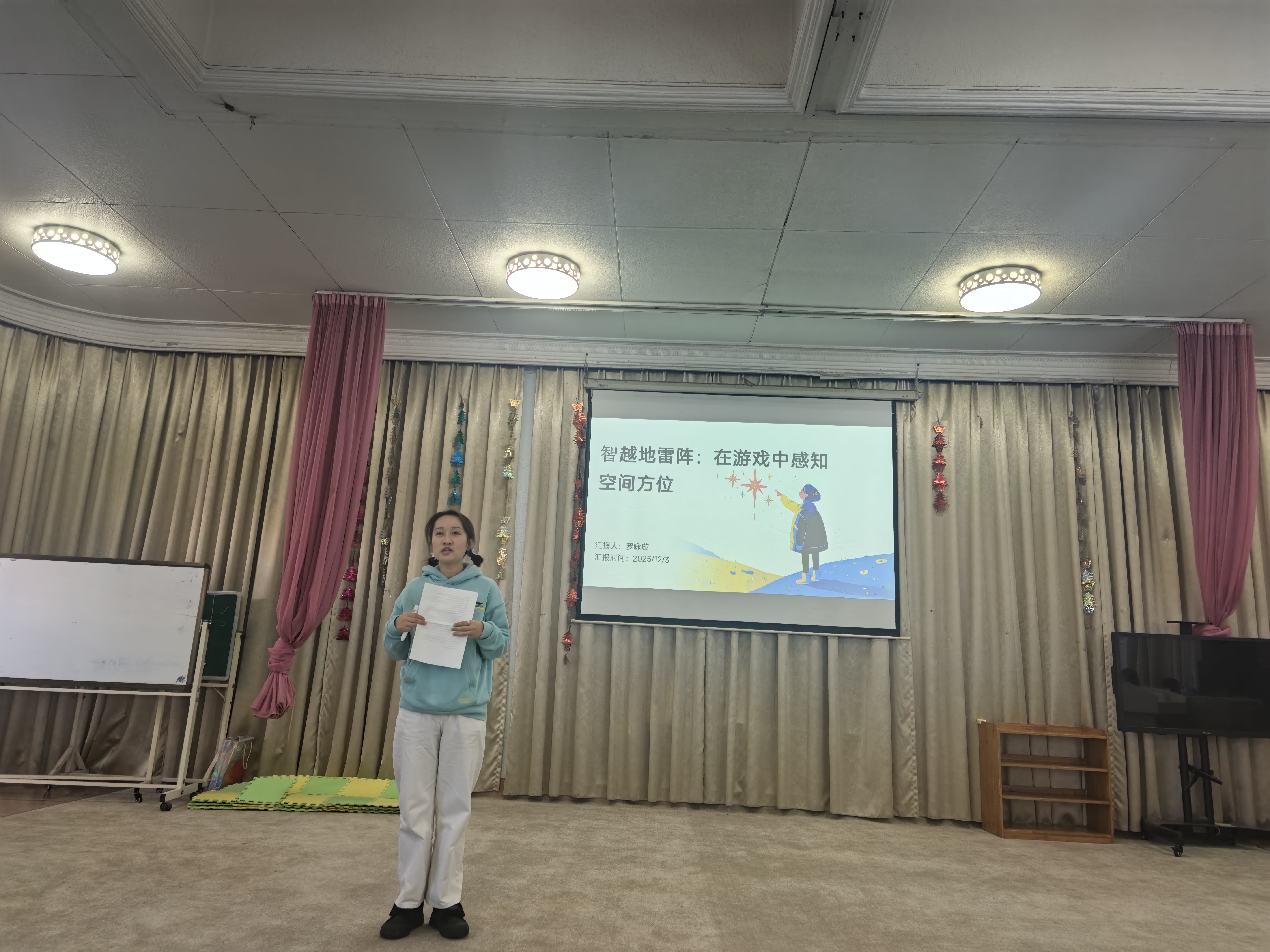 罗咏璇老师说明了将空间方位、指令理解与游戏挑战结合的意图,分享了在“士兵训练”到“分组排雷”环节中如何逐步增加认知难度,并对自己在游戏过程中对幼儿方位语言表达的引导策略进行了反思。