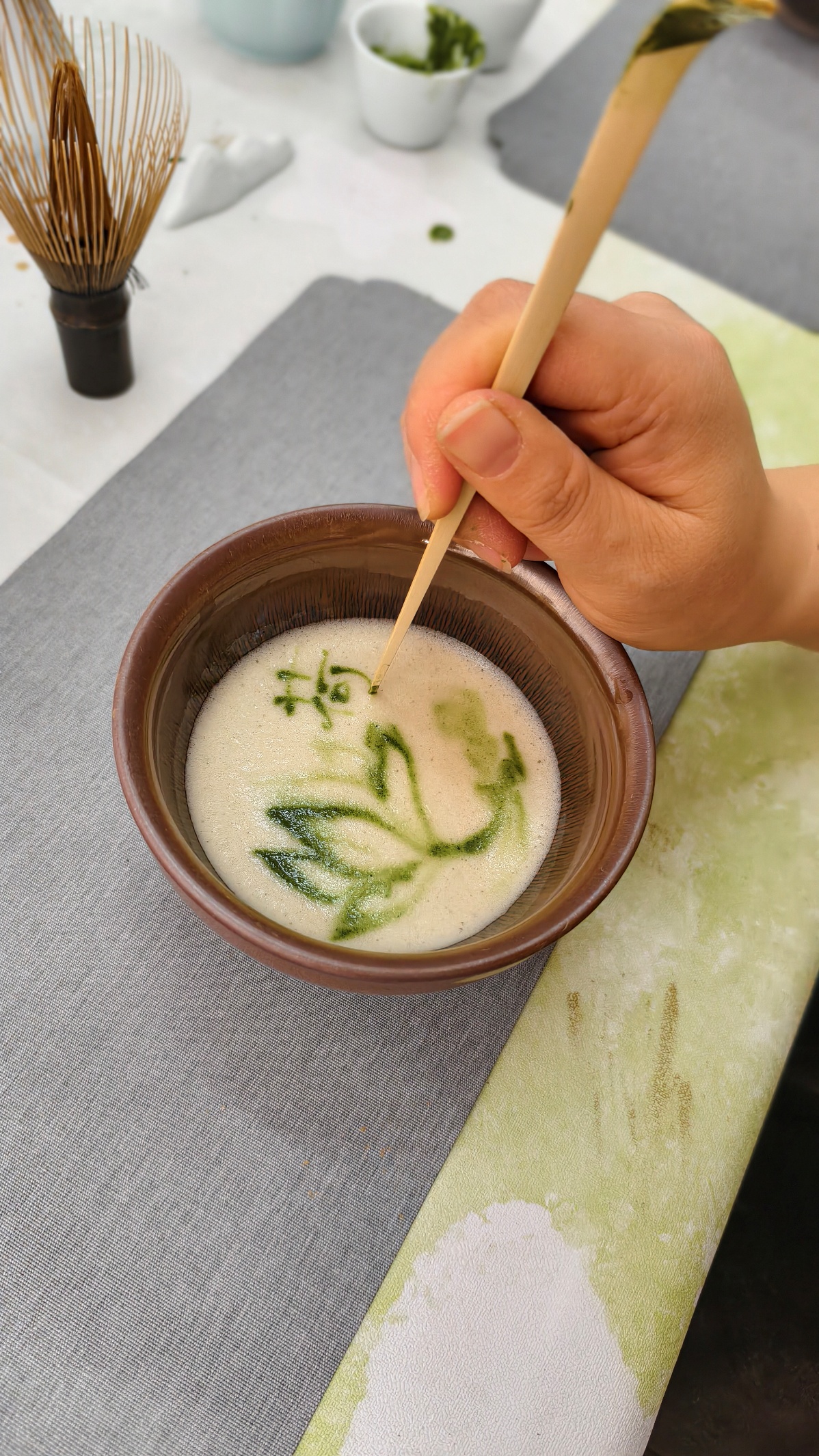 当洁白的沫饽在盏中如凝脂般形成,活动便进入了最富创造性的阶段——茶上作画。同学们以少量调好的茶粉为“墨”,以茶匙为“笔”,在泡沫的细微起伏间谨慎落“笔”。或写下篆、隶、楷、行等不同字体的“福”字,寓意吉祥;或勾勒出荷花清韵、兰草幽姿、竹枝挺立的图画。清水与茶粉的浓淡变化,在白色茶沫上显现出深浅有致的线条与图案,一幅幅清新雅致、充满文人意趣的“茶画”于盏中悄然绽放。