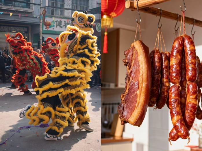 街头狮舞腾跃,金红瑞兽踏碎旧岁尘埃,锣鼓声震落枝头寒峭,鼓点与笑语交织成新春的序曲;悬垂的腊味泛着莹润光泽,在红灯笼的暖光里静静酝酿,将岁月的醇厚与团圆的期盼沉淀成舌尖的绵长。